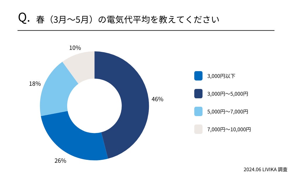 春の平均電気代は「3,000円~5,000円」が46%という結果となっています。