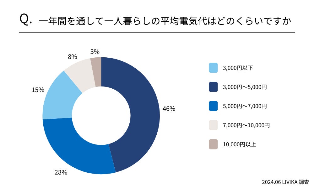 一年間の平均電気代で最も多かったのは「3,000円~5,000円」で46%という結果となりました。