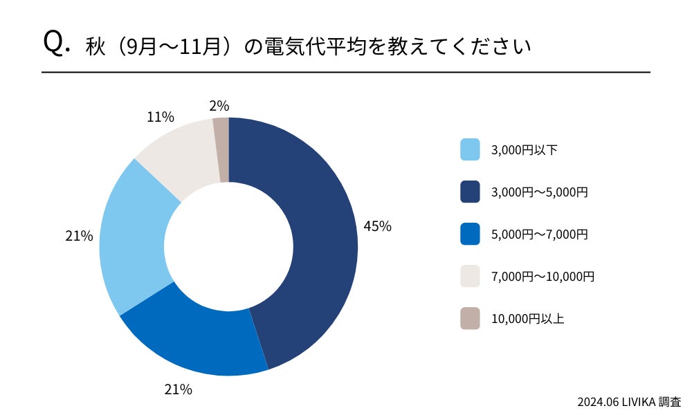 秋の平均電気代は「3,000円~5,000円」が45%と一番多い結果となりました。