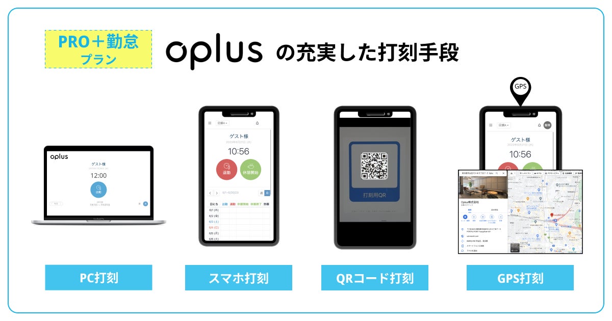 「oplus」の勤怠管理では、様々な働き方に合わせてより便利に利用できるよう、複数の打刻方法に対応しています。