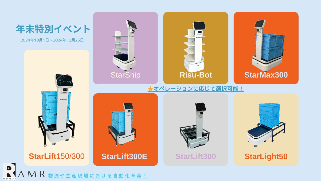 社会がより進歩するために、人々がより幸せになるために、をモットーに活動するロボットバンク株式会社(本社:東京都新宿区)は、2024年度の年末を迎え、【10月1日〜12月25日】までの期間限定で皆様の業務効率向上を応援するための特別イベントを開催いたします。本イベントでは、当社取り扱いのロボット製品が特別価格でご提供される、年に一度のビッグチャンスです。