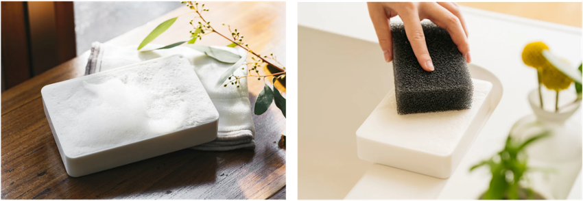 ダイニチ・コーポレーションは創業から、食器洗い用固形洗剤の製造販売を行っています。製造から販売を行う中で、固形洗剤と相性の良いスポンジを研究し、高品質ポリウレタンを使用した、従来のスポンジの概念を覆す「サンサンスポンジ」が生まれました。半年以上使えるほど丈夫で長持ちなので、ごみの削減に。