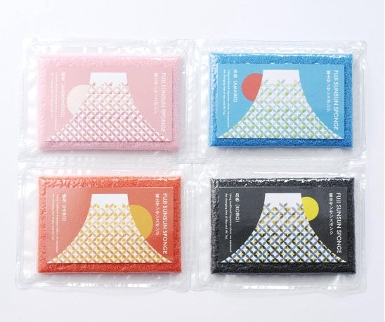 50周年を記念して、新色(ブルー)が富士山のパッケージと共に新登場しました。日本人の心の拠り所である富士山。眺めるだけでなんだか心が洗われるような、そんな存在を身近に感じることで、洗う時間がもっと豊かになりますように。そういった願いを込めて制作したスポンジです。調和やご縁を意味する日本古来の七宝という和柄できらめく泡を、富士山を彩る1日の移ろい(朝、昼、夕、晩)を日本の伝統色(曙色、天色、緋色、呂色)を用いて表現しています。
