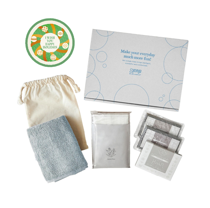 内容:サンサンスポンジ 2個/サンセブンハイアール 100g/サンサンフキン グレー/オリジナルタオル/オリジナルギフトボックス入り
