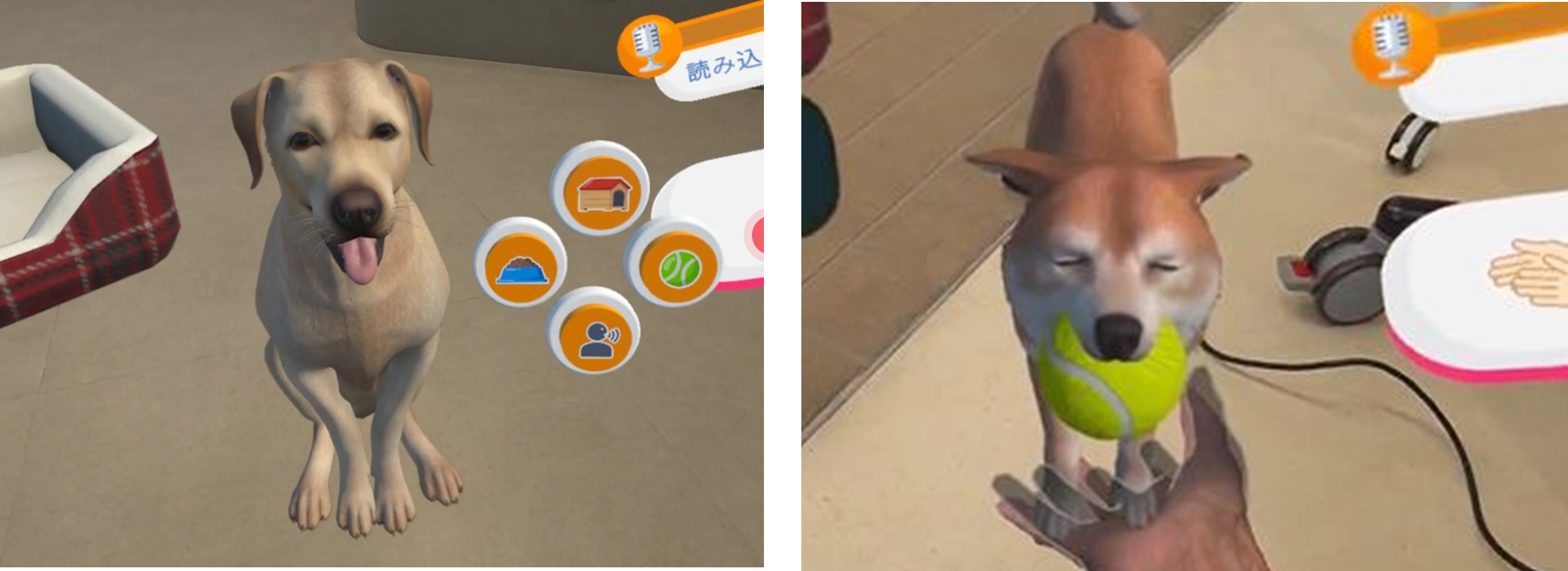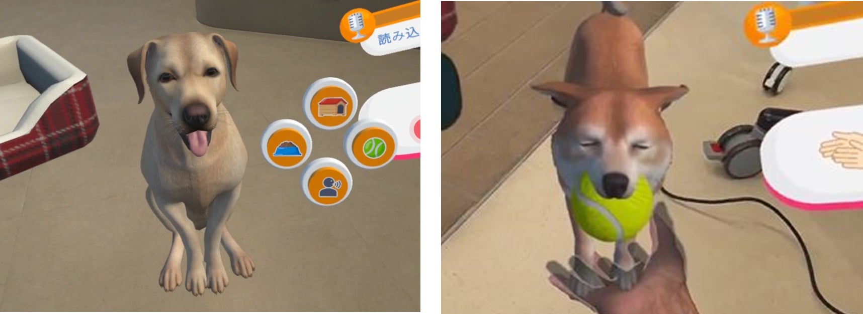 バーチャル犬が、利用者の声やハンドサイン、ボタン操作に反応します。