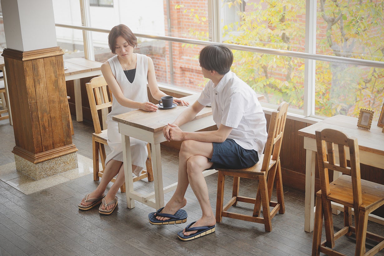 一般的な下駄は硬く歩行時の衝撃がダイレクトに足裏へ伝わる傾向があります。「Leggiero-然-」は、八ツ折構造により足の動きに合わせてしなり、衝撃を逃がすことで長時間の歩行でも疲れにくい設計です。