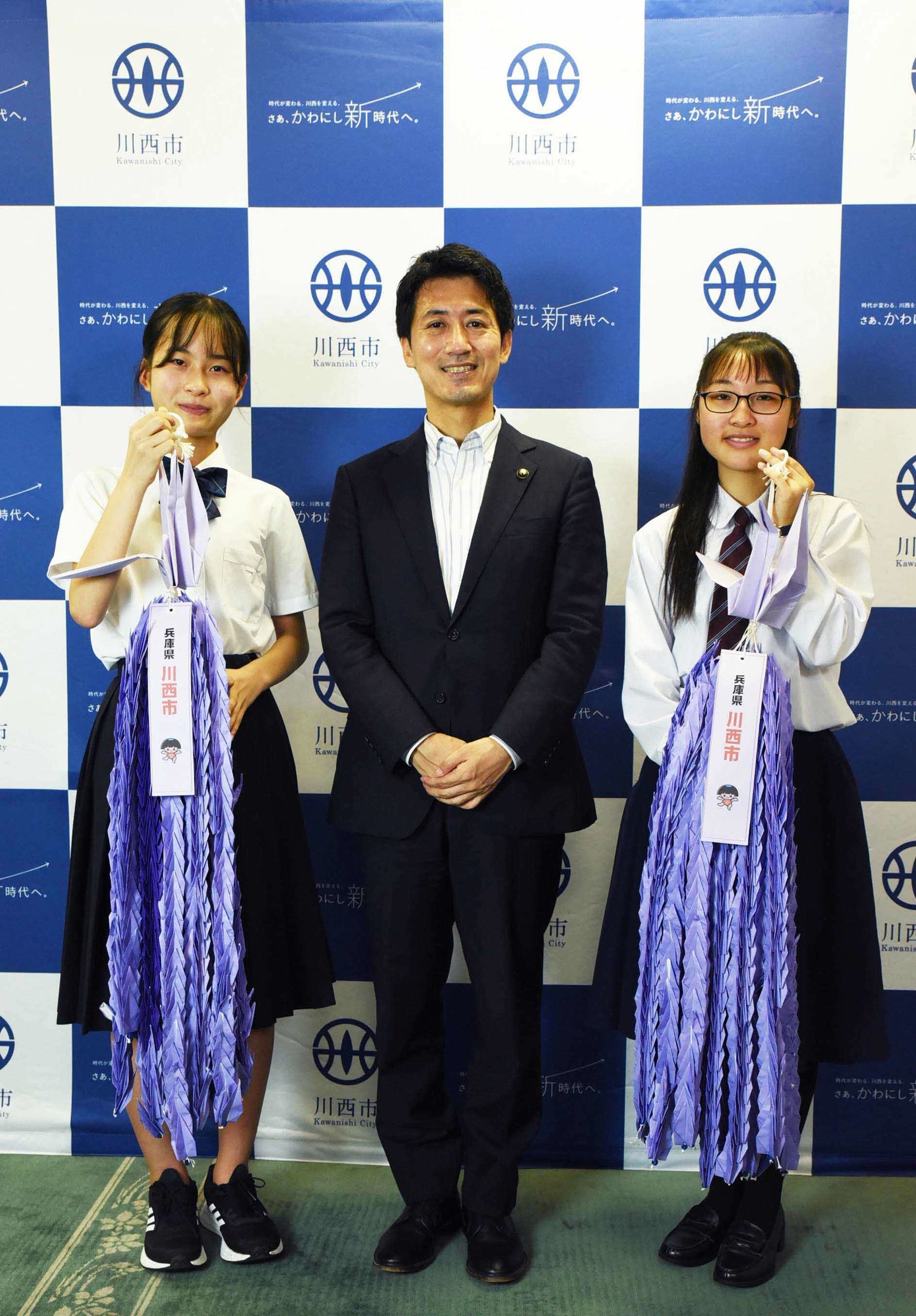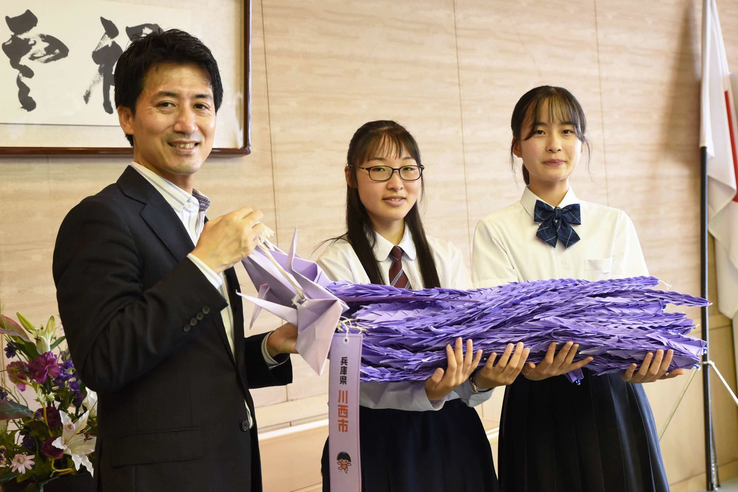27日、公募で選ばれた「折り鶴平和大使」の井上 七海さん(いのうえ ななみ、川西緑台高校3年生)と甲斐 純怜さん(かい すみれ、緑台中学校2年生)が、川西市役所を訪問。越田謙治郎川西市長から市民の平和への想いが込められた折り鶴約10,000羽のうち、1,000羽が手渡された。2人は8月6日、広島で平和記念式典に参列し、折り鶴を捧げる。新型コロナ感染症の影響で折り鶴平和大使派遣は3年ぶり。