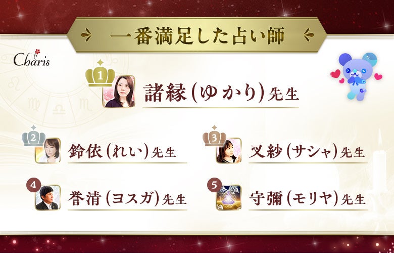 電話占いカリスに在籍する占い師の中から、「最も満足度の高い占い師」を調査しました。