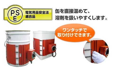 ペール缶・一斗缶の固体、液体(アスファルト、オイル、塗料、チョコレートなど)の取り出しを簡単に行うために開発されたヒーターです。