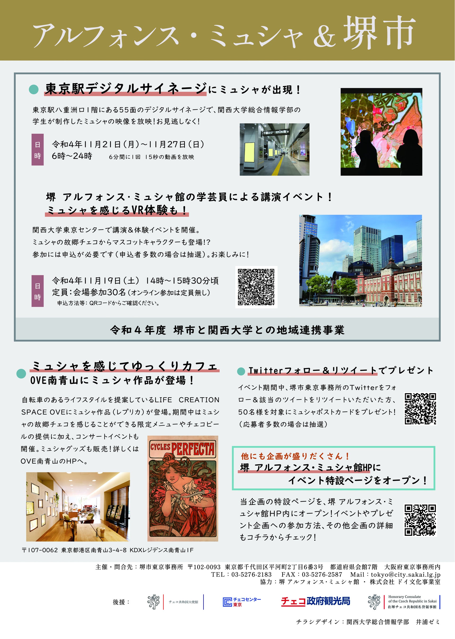 本企画では、「令和4年度 堺市と関西大学との地域連携事業」として実施する東京駅に設置されているデジタルサイネージのミュシャ映像の放映、関西大学東京センターでの講演及びVR体験イベントに加え、南青山のLIFE CREATION SPACE OVE(カフェ)での関連イベントや、ミュシャ作品レプリカ等の展示及びグッズ販売を実施します。