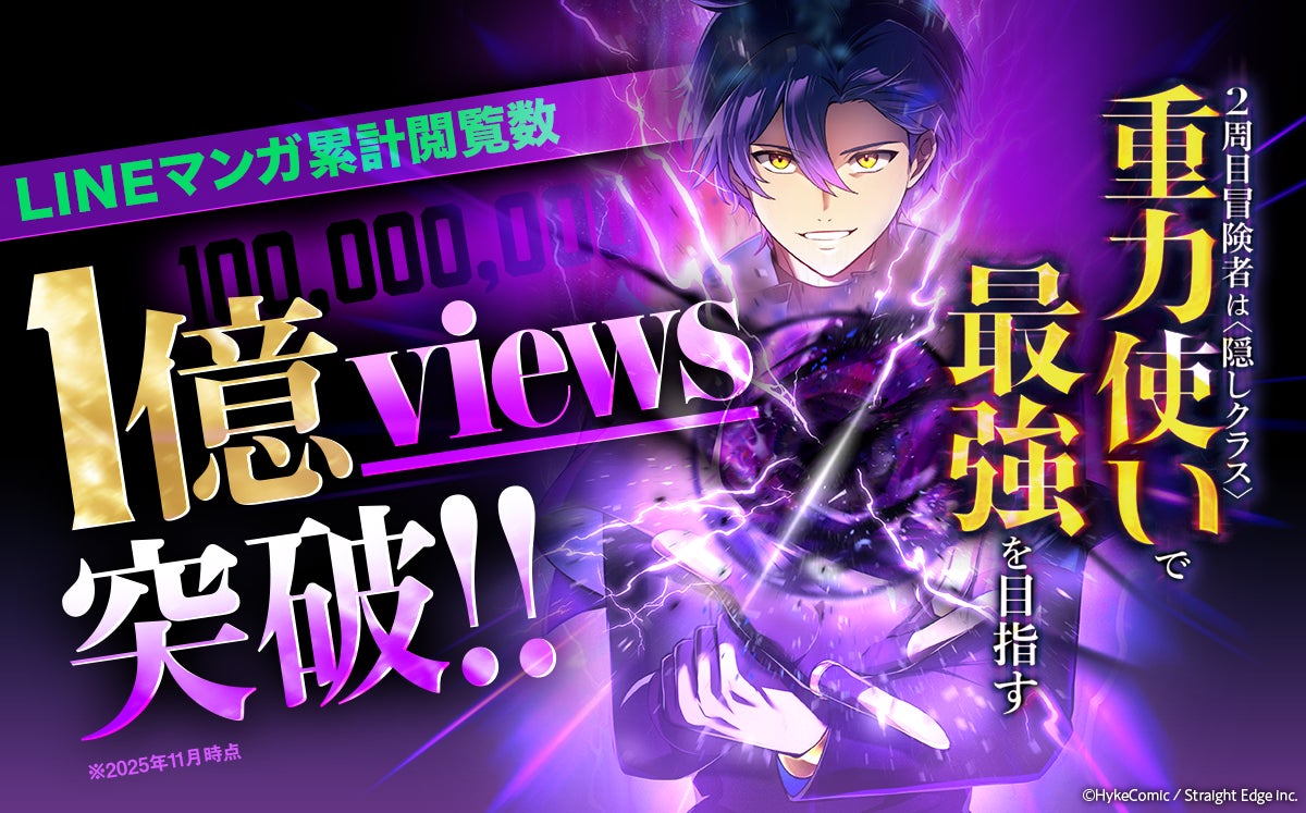 株式会社HykeComic(所在地:東京都品川区、代表取締役:香田哲朗、株式会社アカツキの100%子会社)と株式会社ストレートエッジ(本社:東京都千代田区、代表取締役:三木一馬)が共同制作を行った『2周目冒険者は隠しクラス〈重力使い〉で最強を目指す』がLINEマンガの累計閲覧数 1億Viewsを突破いたしました。(2025年11月時点)