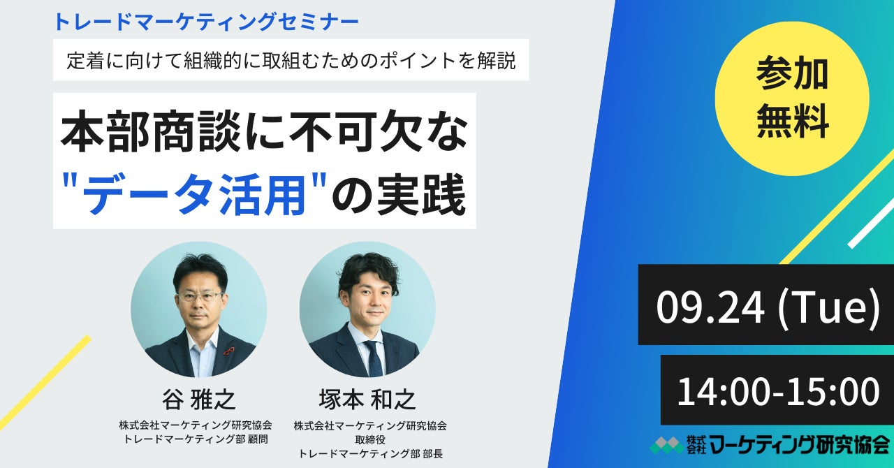 株式会社マーケティング研究協会トレードマーケティング部は2024年9月24日、消費財メーカーを対象にオンラインセミナー「本部商談に不可欠なデータ活用の実践 -組織的な定着に向けた課題-」を開催する。