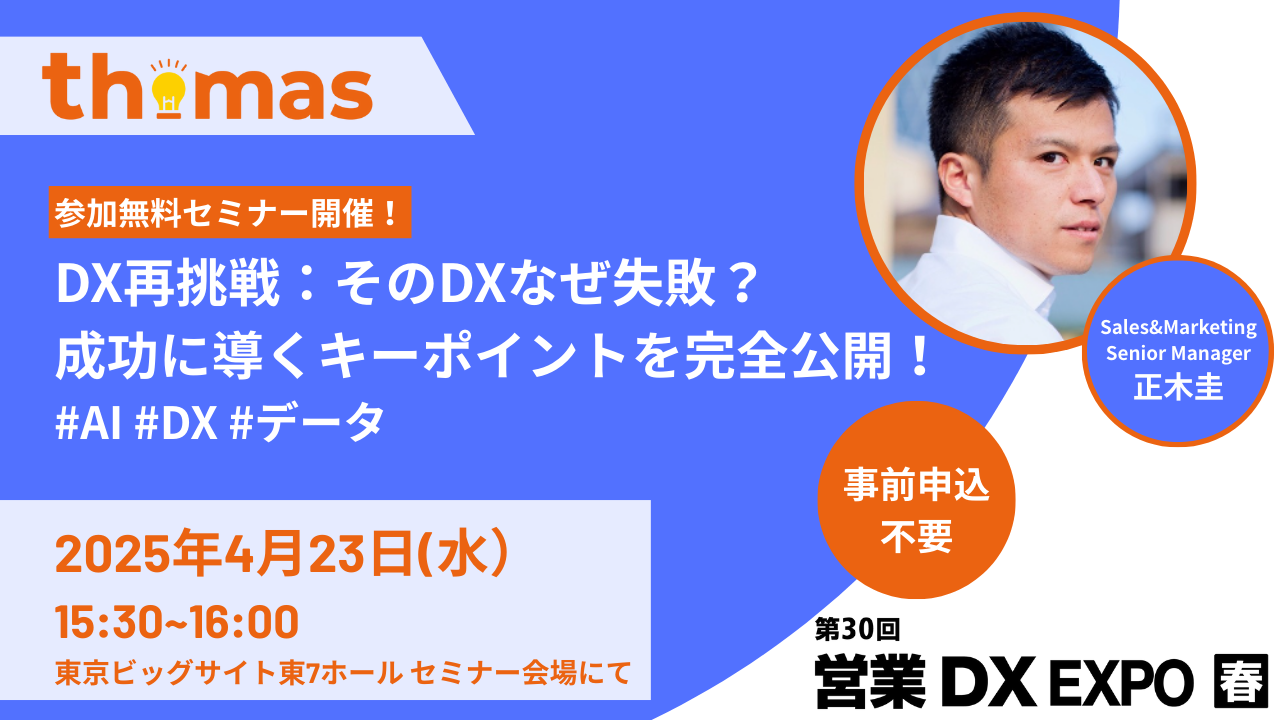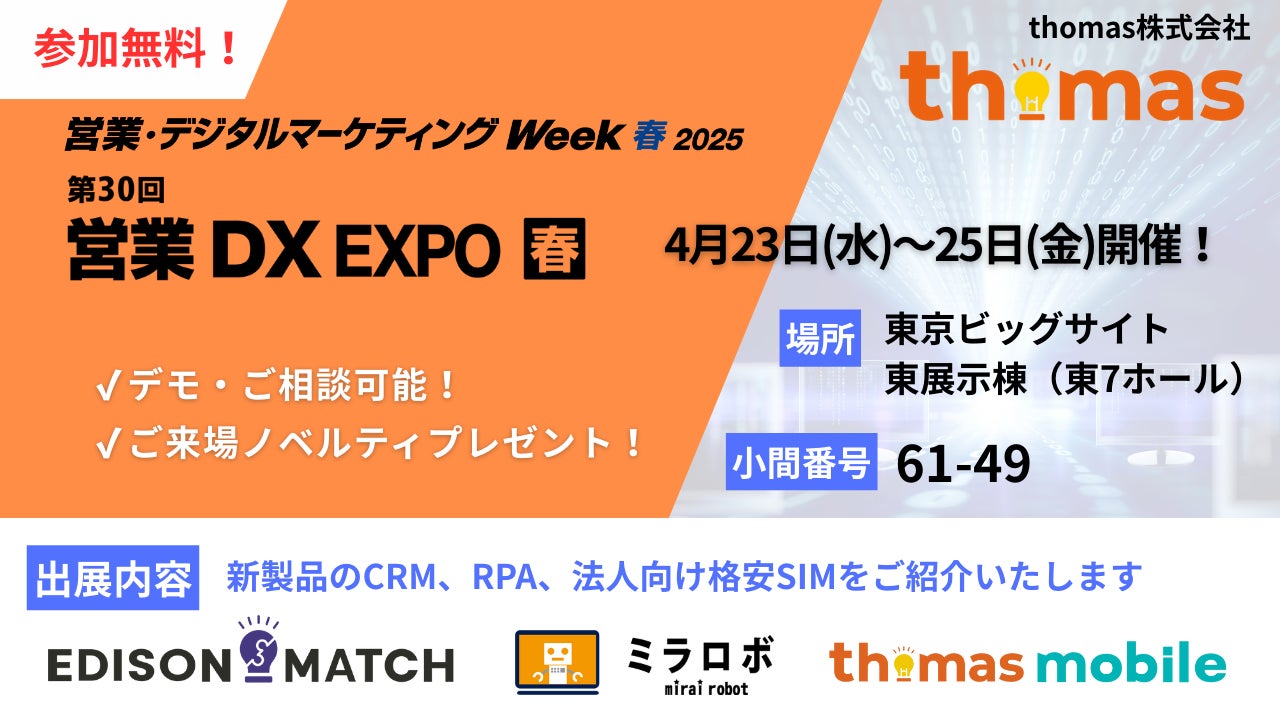 IT総合ソリューションを展開する thomas株式会社(本社:東京都港区、代表取締役:広瀬和行、以下「thomas」)は、2025年4月23日(水)〜25日(金)に東京ビッグサイトで開催される「営業・デジタルマーケティング Week【春】」 内「営業DX EXPO」に初出展いたします。