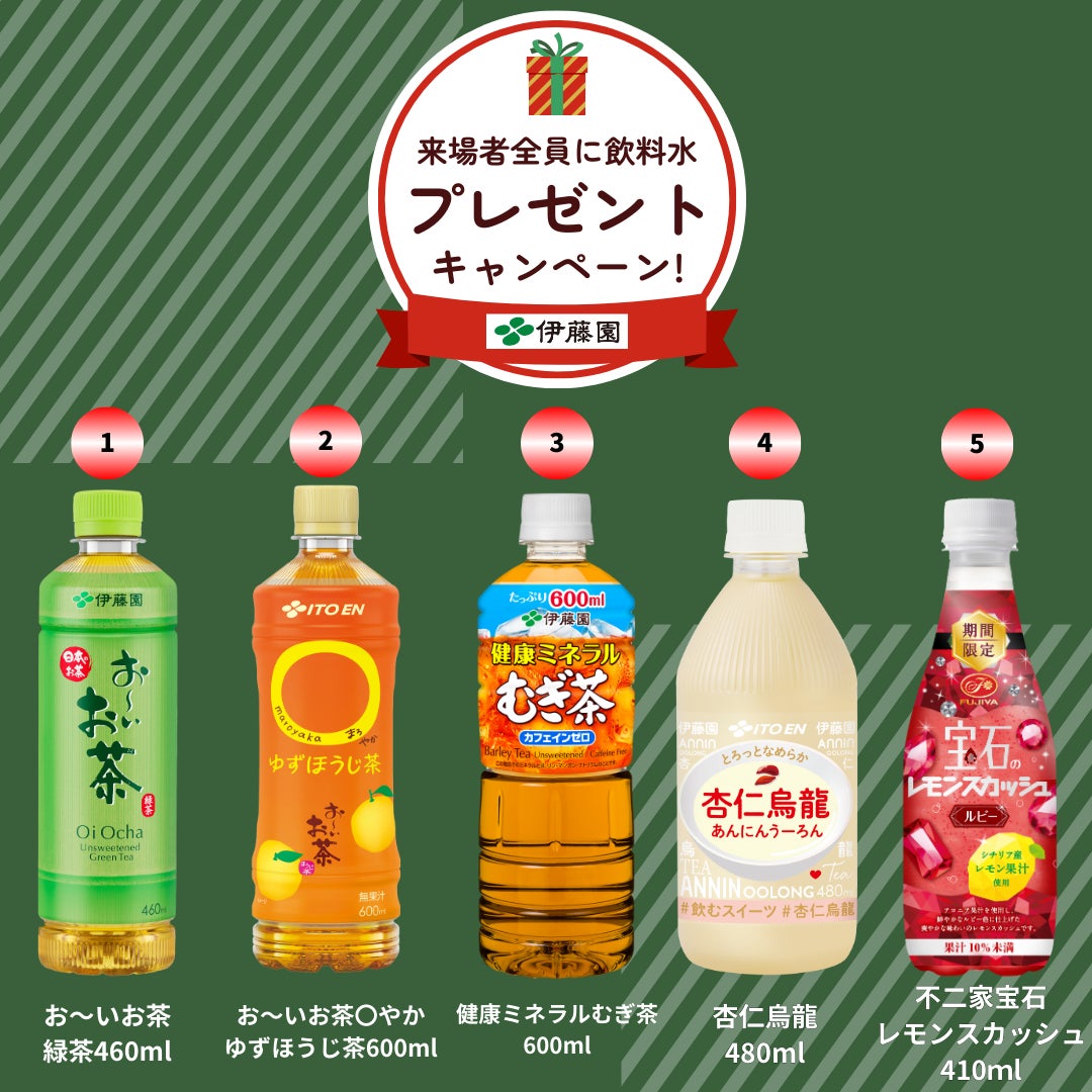 おーいお茶をはじめ健康ミネラル麦茶など、伊藤園商品5種類の中からお好きな飲料水を1本無料でプレゼントいたします。