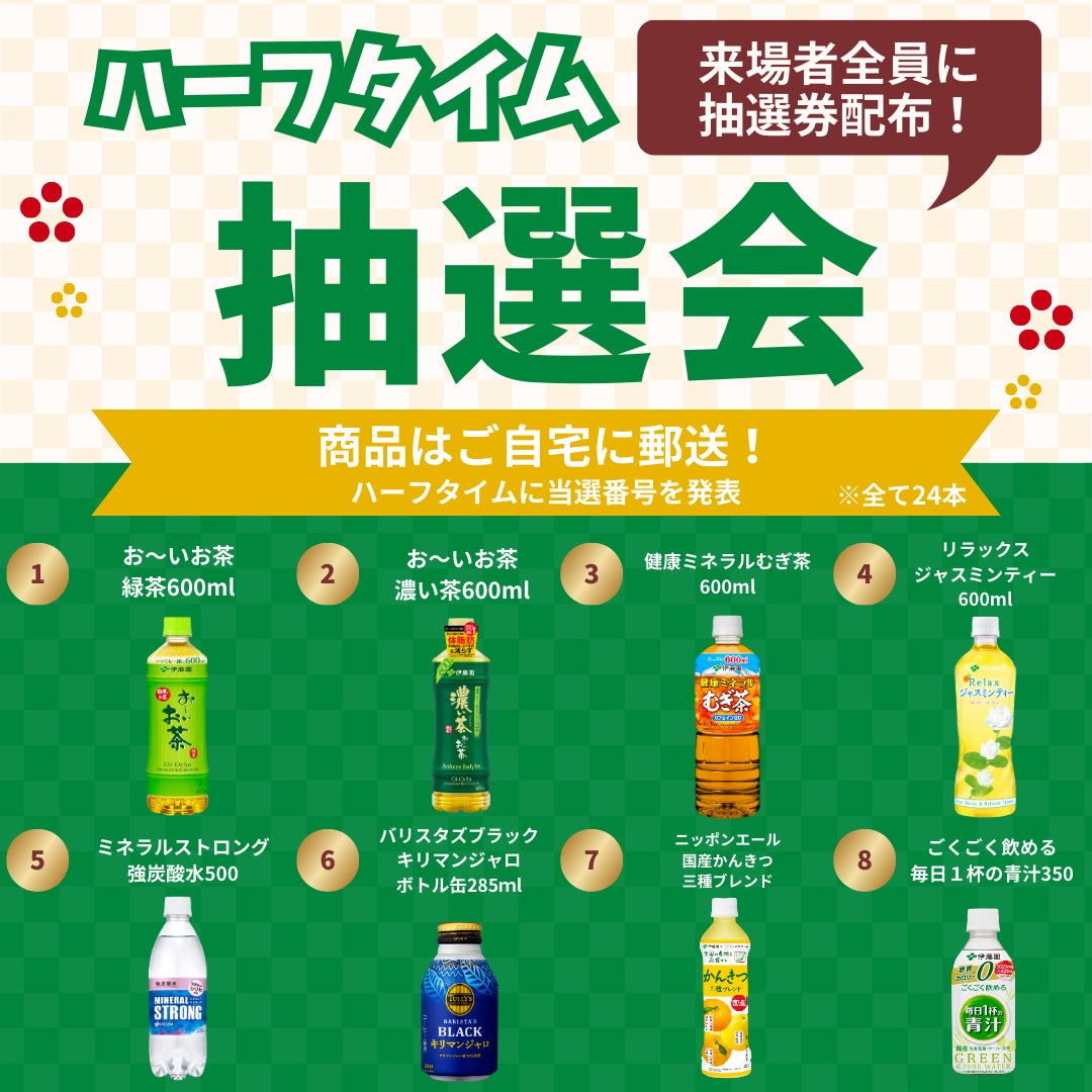 入場時に抽選権をお配りし、抽選で10名様に伊藤園商品が当たる抽選会を実施したします。当選者にはお好きな飲料水を1ケース分プレゼントいたします(後日、ご自宅まで無料で配送)。当選番号はハーフタイムで発表予定です。