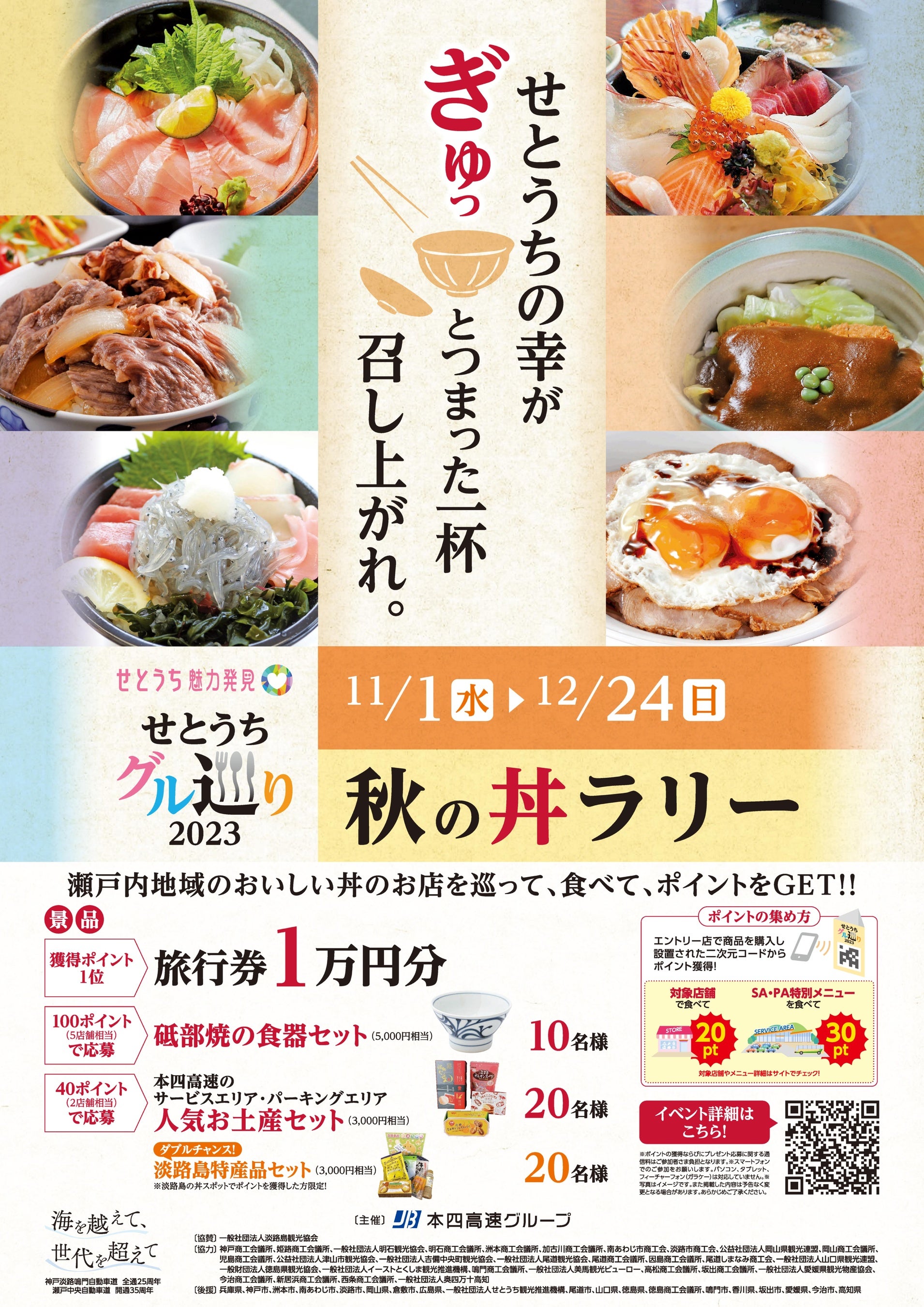 また、11 月上旬に、瀬戸内のグルメに関するフリーペーパー『せとうちグルメ通信』の第3弾の発刊を予定しており、本四高速の SA・PA 等に配架します。秋の丼ラリーに参加するお店の紹介や瀬戸内地域の丼特集等の盛りだくさんの内容となっています。