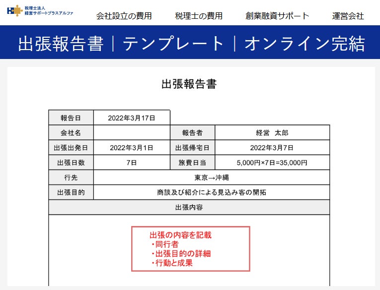 「出張報告書|テンプレート|オンライン完結」:https://keiei-support-plus-a.com/zeirishi-hiyou/shucchou-houkokusho-template/
