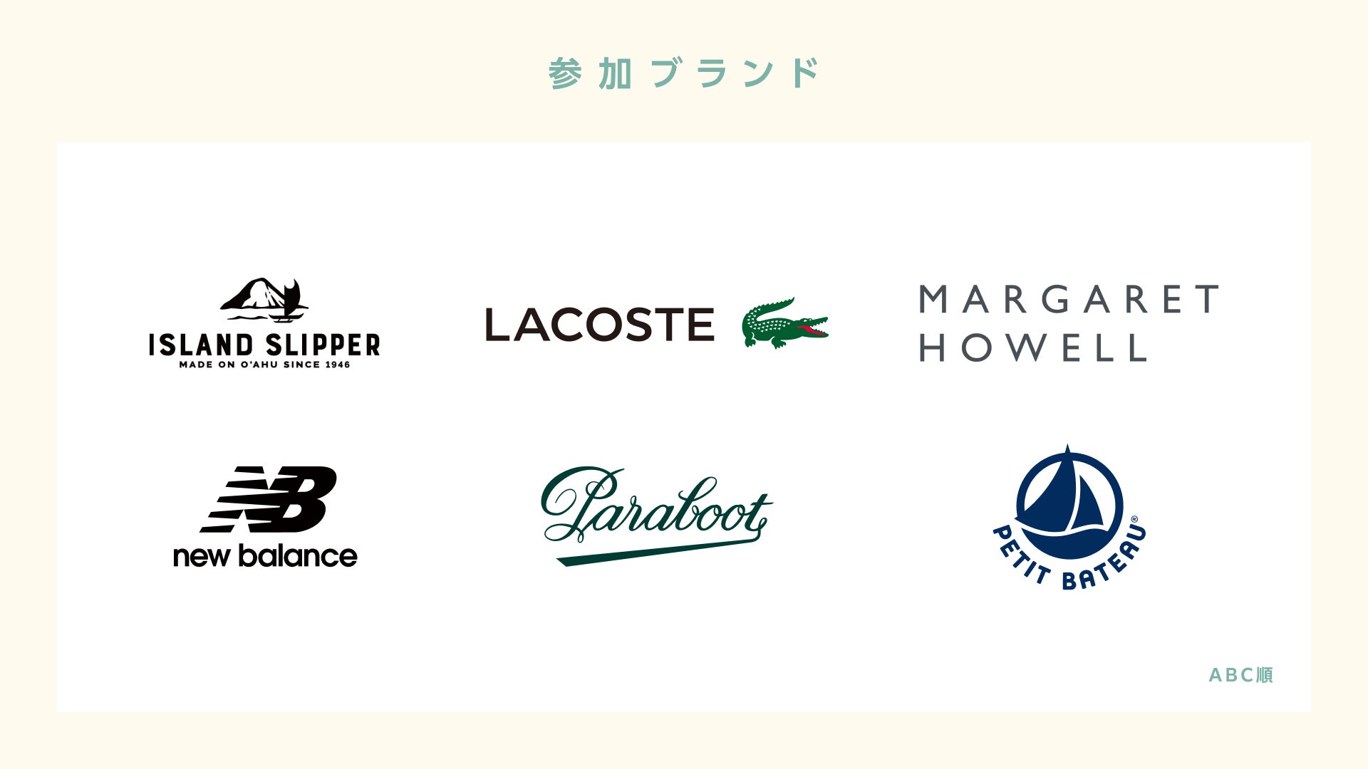 出店ブランド: ISLAND SLIPPER / LACOSTE / MARGARET HOWELL / New Balance / Paraboot / PETIT BATEAU(ABC順)