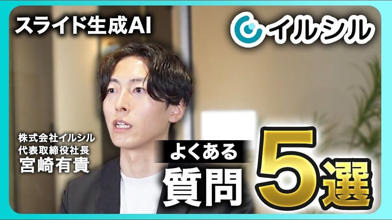 AI搭載スライド自動生成サービス「イルシル」を提供する株式会社イルシル(本社:東京都渋谷区、代表取締役 宮﨑有貴)は、利用者から寄せられた問い合わせをもとにしたFAQコンテンツ「よくある質問 TOP5」を公開しました。本コンテンツでは、編集機能の自由度、フリー/パーソナル/法人の各プラン内容、自社テンプレートの取り込み可否、商用利用の範囲、そしてサービスの最大メリットという五大テーマをランキング形式で紹介し、創業者の宮﨑が一問一答で要点を解説しています。FAQは公式サイトおよび公式YouTubeチャンネルで閲覧でき、導入検討中の個人・法人が抱える疑問を解消し、資料作成の効率化を後押しすることを目的としています。