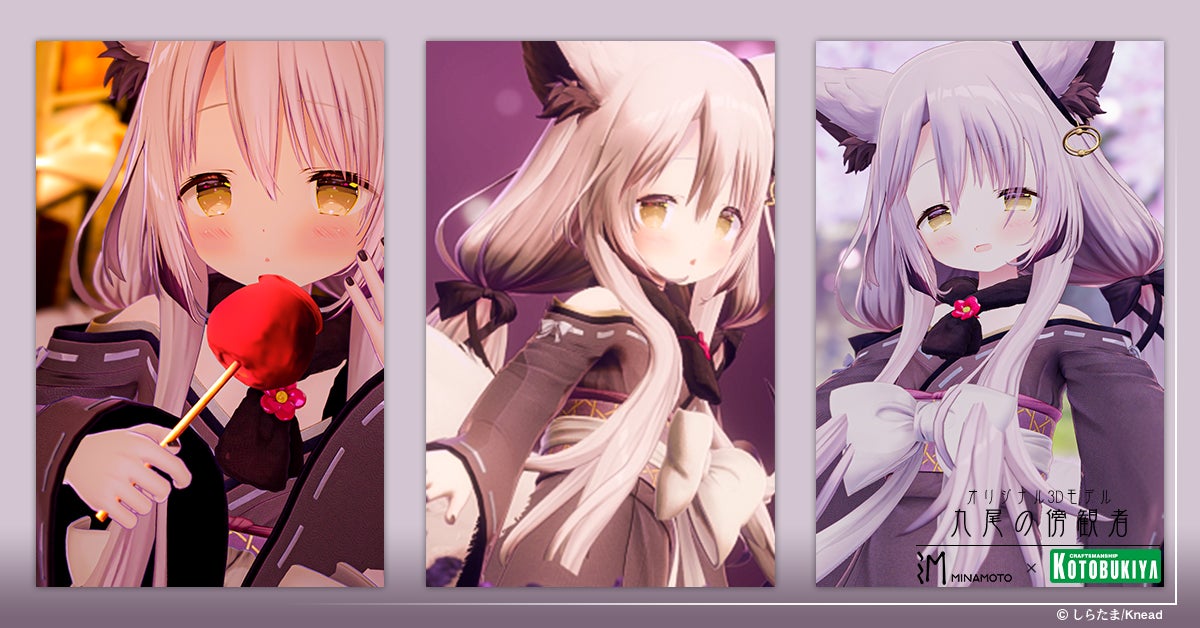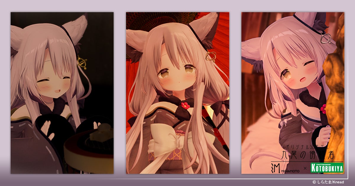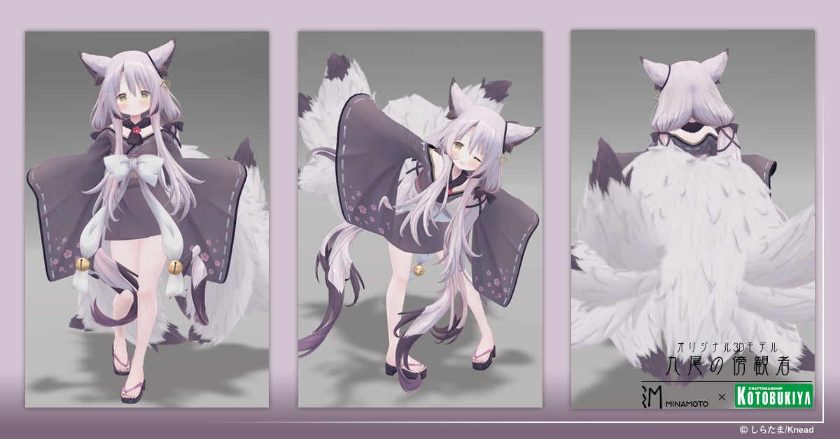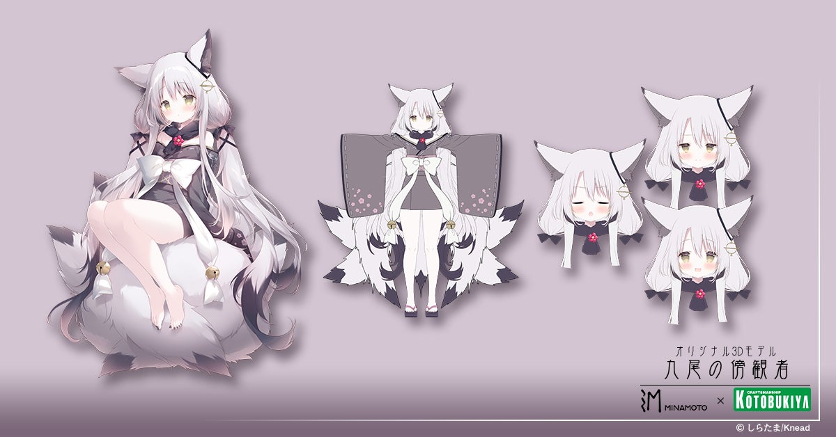 「原型師」というクリエイターの可能性や、その世界をより多くの⼈々に知ってもらおうという⽬的で⽣まれたプロジェクトがMINAMOTO。九尾の傍観者はMINAMOTO×絵師100人展コラボ企画において、イラストレーターしらたま⽒が「オリジナルのターン」としてデザインしたラフ稿を基に、株式会社Kneadが「共作のターン」として造形でアレンジを加えて⽣み出した、イラスト、フィギュアの両⽅にわたって展開されるデザイン、造形となります。