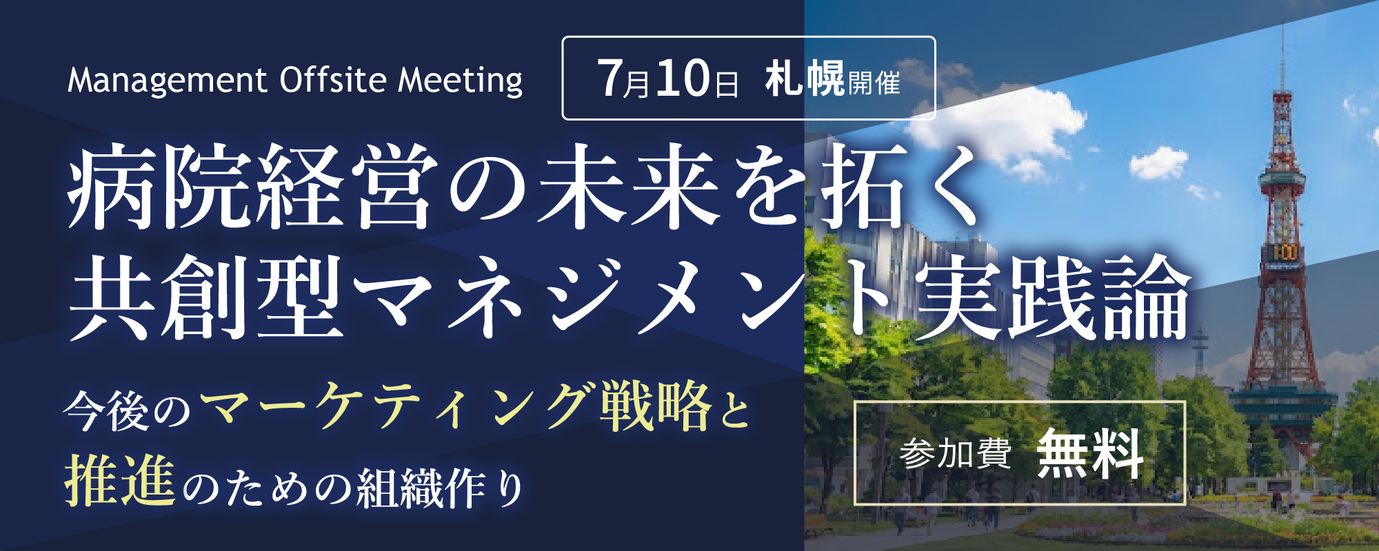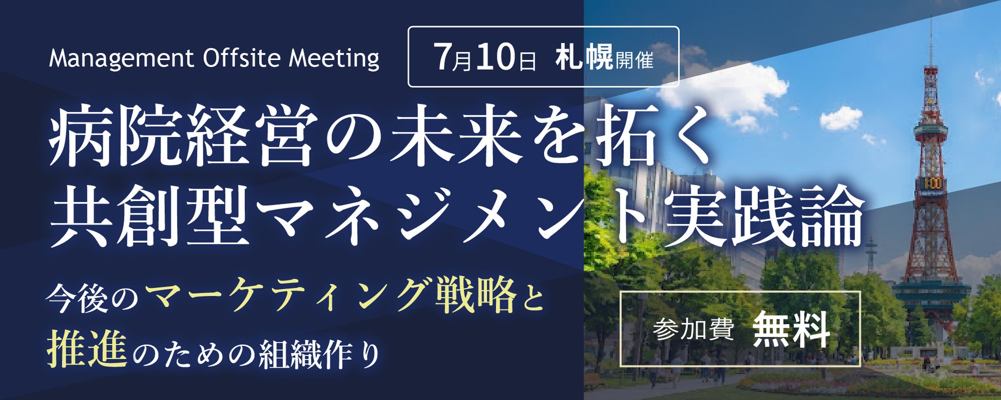 株式会社日本経営(本社:大阪府豊中市、代表取締役社長:橋本 竜也、以下 日本経営)は、2026年7月10日(金)、札幌にて医療機関の経営者層を対象とした「Management Offsite Meeting」を開催します。本イベントでは、地域医療を取り巻く課題に対し、「共創」を軸とした病院経営のあり方と実践的なマネジメント手法について、専門家による講演と参加者同士の交流を通じて共有します。