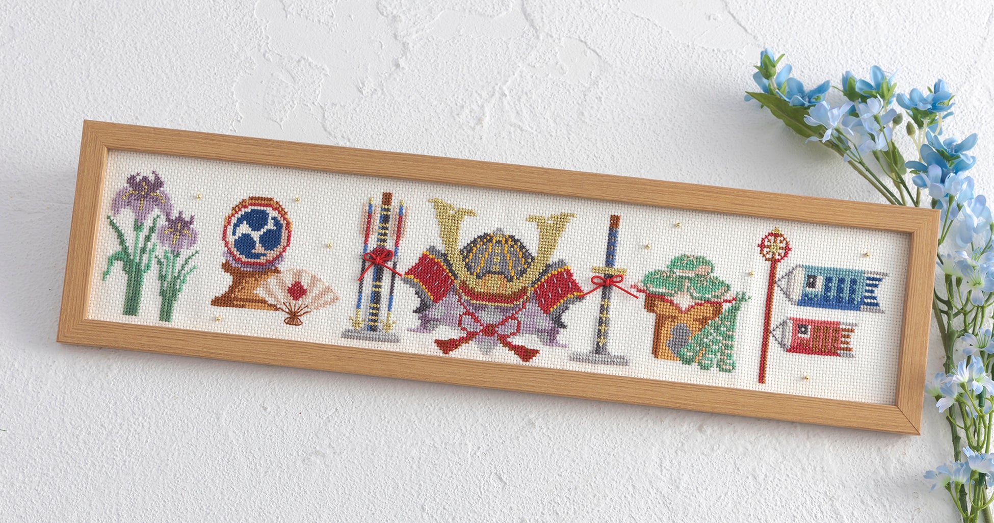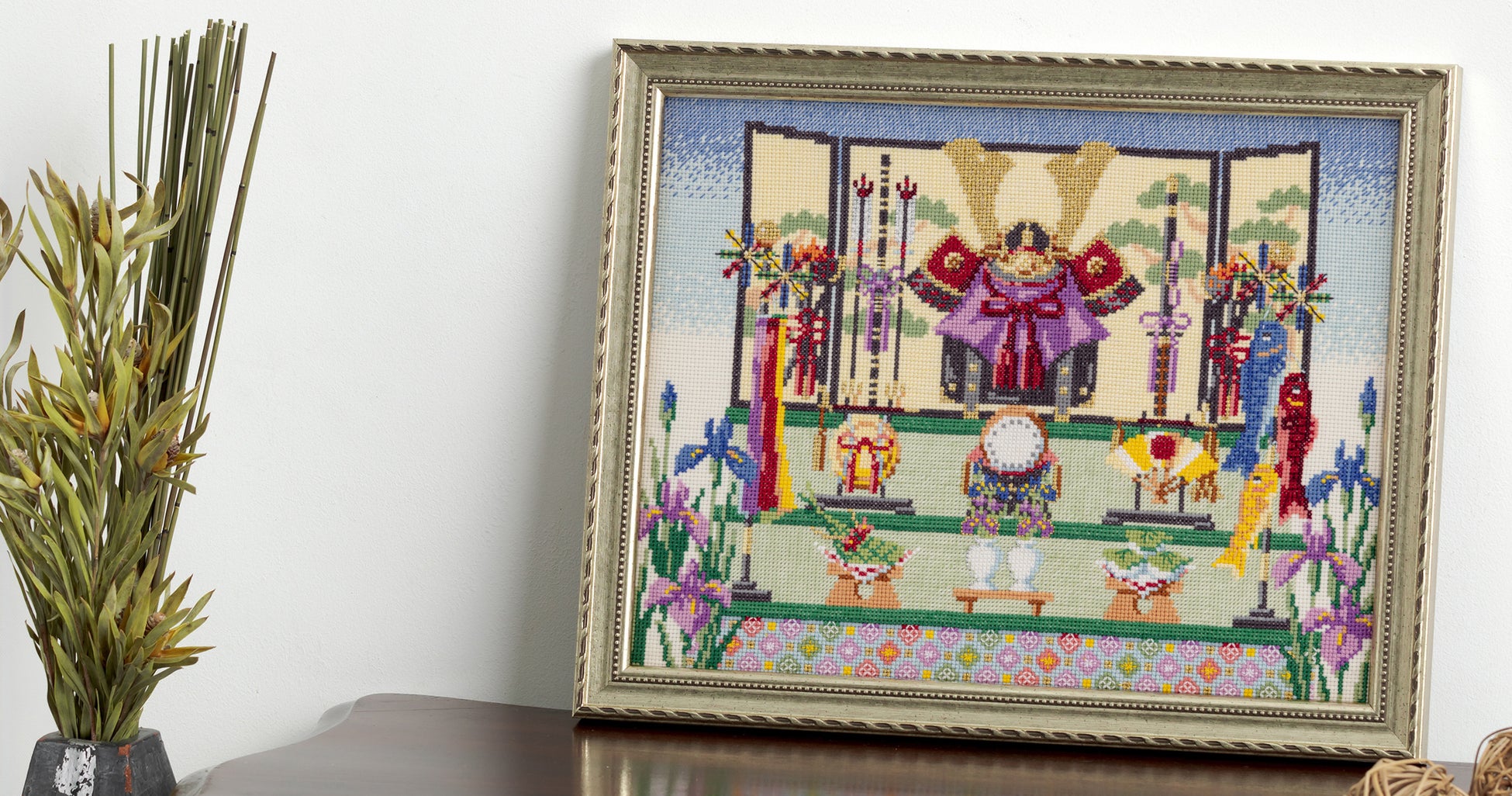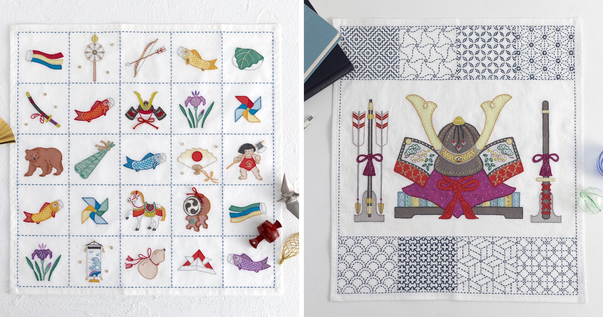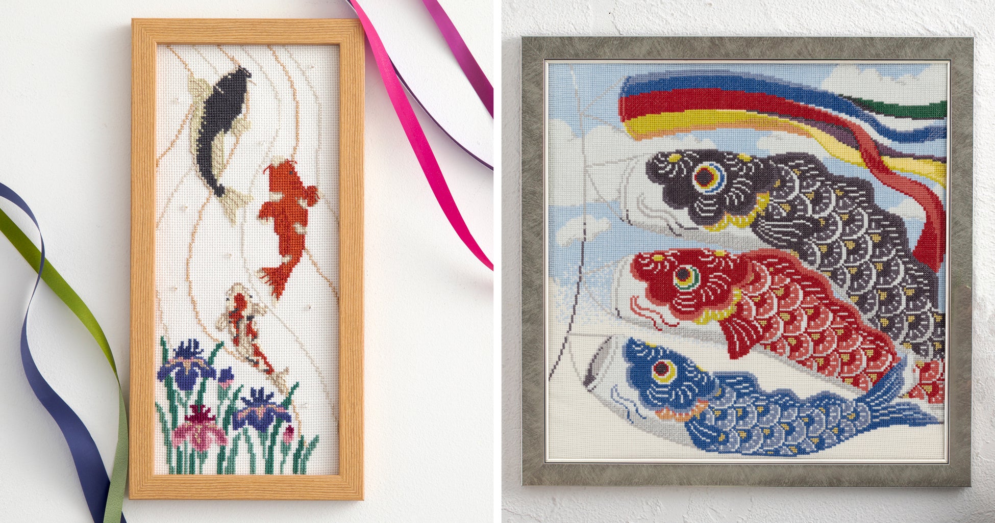 モチーフが色印刷された生地に刺しゅうと刺し子で華やかさをプラスするステッチクロスや、縁起の良い錦鯉の滝のぼり、5月の空を優雅に泳ぐこいのぼりなどの兜飾りと一緒に飾りたくなるキットも再販いたします。