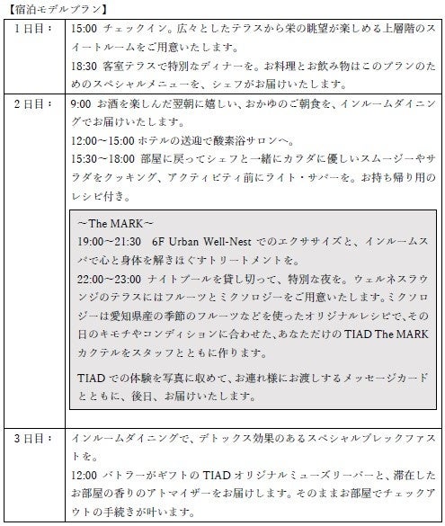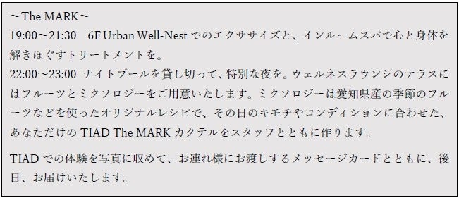 「TIAD, オートグラフ コレクション」(所在地:名古屋市中区栄5-15-19、総支配人:中澤旬史、以下 TIAD)は、良質な睡眠を届ける限定プラン、2泊3日の “The MARK”をご提供します。