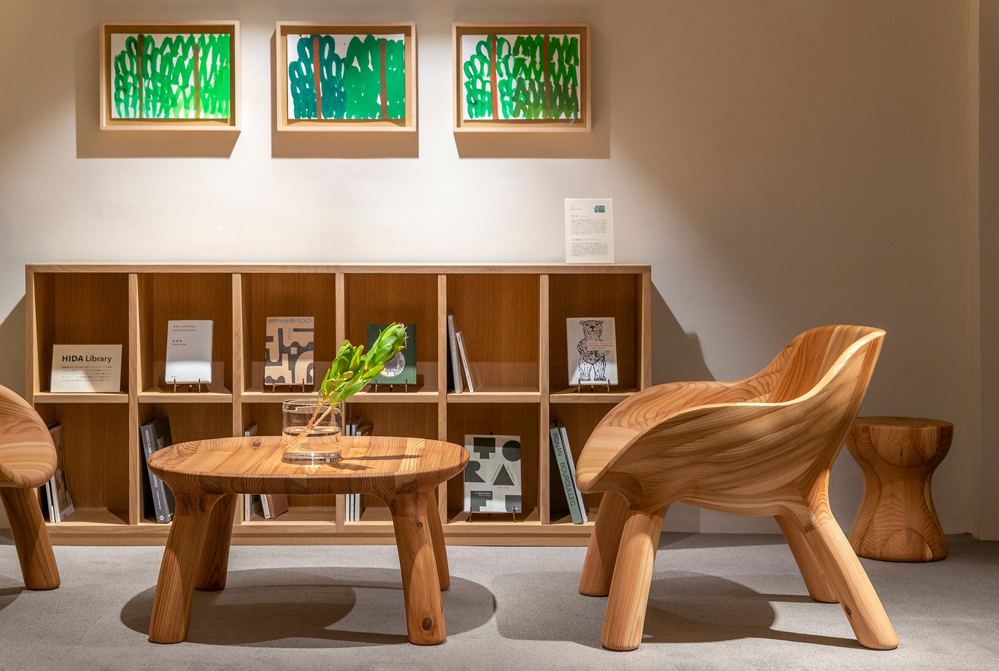 HIDAのコレクションの中には、エンツォ・マーリや柳宗理、隈研吾など国内外で活躍する建築家やデザイナーとの協働によって生まれた家具が数多く存在します。そうしたデザイナーへの敬意と、飛騨産業のものづくりの姿勢を伝える場として、関連書籍を集めたライブラリーと、国際的なアワードの受賞作を紹介する展示コーナーを新たに設けました。HIDAの家具の背景にある思想や物語に触れていただけるスペースです。