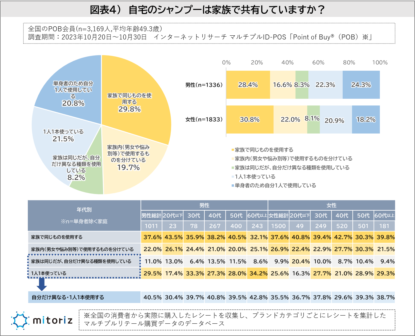 「家族は同じだが、自分だけ異なる種類を使用している」「1人1本使っている」を合わせた29.7%の人が家庭内で自分専用のシャンプーを使っていることがわかりました。単身者を除き年代別をみると男性の方が年代を増すごとに「自分だけ異なる種類を使用する」「1人1本使用する」の比率が高くなっています。女性は男性と比べて家族内でシャンプーを共有して使用している傾向がありそうです(図表4)。