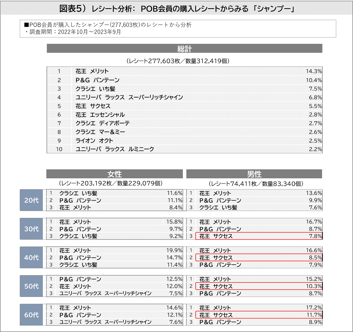 POB会員の投稿レシートデータから同カテゴリの商品ブランドの構成比をあらわしたものです(調査期間:2022年10月~2023年9月、レシート合計277,603枚)。1位は「花王 メリット(14.3 %)」、2位「P&G パンテーン(10.4%)」、3位「クラシエ いち髪(7.5%)」が上位に続きました。王道商品が続くも、2022年に発売された「クラシエ マー&ミー」が8位にランクインしています。