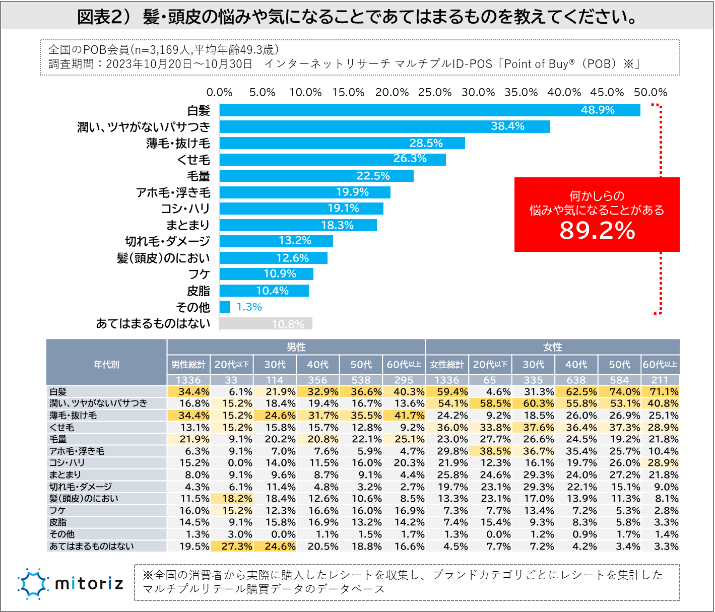 髪の悩みは「白髪」が5割で最も多く、女性は年代を問わず「くせ毛」「髪の潤い」の悩みも上位に