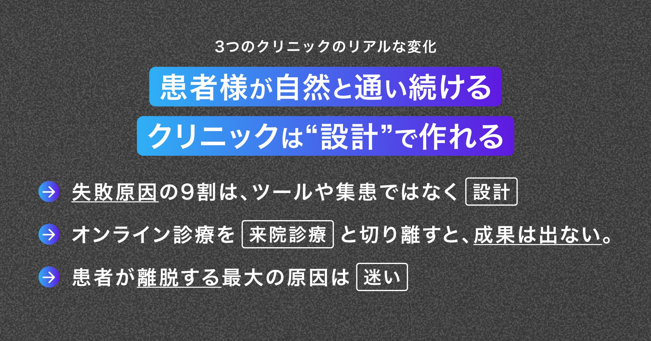 セミナータイトル:「3つのクリニックのリアルな変化:患者様が自然と通い続ける医院は“設計”で作れる」