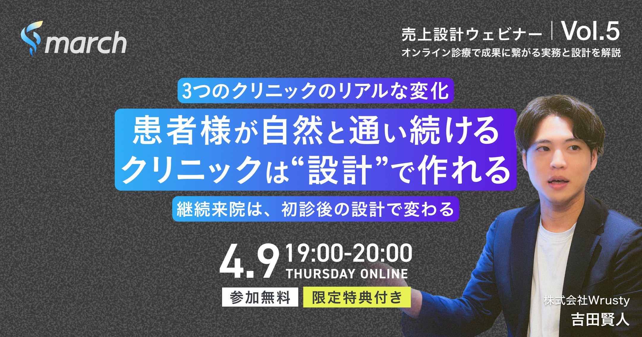 LINEを活用した集患と継続収益まで自動化することで、医療機関の “成果に責任を持つ” オンライン診療・集患オペレーションシステム「march」を展開する株式会社Wrusty(本社:東京都渋谷区、代表取締役:上田遼)は、全国の開業医・開業予定医の皆様を対象に、無料オンラインセミナー「3つのクリニックのリアルな変化:患者が自然と通い続ける医院は“設計”で作れる」を2026年4月9日に開催いたします。本セミナーでは、規模や診療科目の違うそれぞれの医療機関の成果に繋がったオンライン診療の動線設計と、なぜ「march」を活用している医療機関は1年間で9倍という収益に繋げることができているかを、再現性の高い設計という観点から解説します。