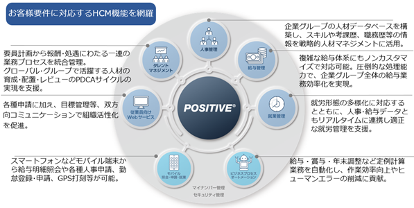 POSITIVEは、人事・給与・就業管理に加えて、タレントマネジメント支援やグループ会社管理など、広範な業務機能を網羅した統合人事システムです。従業員は、担当している職務または将来目指す職務に必要な「知識、技能・技術、経験」に対して、本人が修得しているスキルを入力することで、現有能力の確認(レベル判定)と、将来行いたい職務に対する不足能力の確認(ギャップ分析)を実施することができます。また利用企業は、従業員の入力データに基づき、能力開発や適材適所な配置を図ることができ、業務の生産性や成果の向上を通した人的資本の強化につなげることができます。データの管理や分析に際しては、企業固有の管理項目を自由に追加することができ、また、グループ各社で資格や役職の定義が異なる場合でも、全社統一基準に読み替えて情報の抽出・分析を行うことができるため、グローバル・グループで活躍する人材の育成・配置にも活用が可能です。