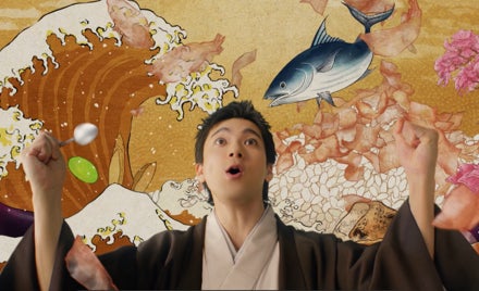 本CMでは、山田裕貴さんが三味線の音に合わせて袴姿で登場。「炭火焼きチキンと和の出汁カレー」をイメージした屏風絵の前に正座し、商品をスプーンで豪快に一口。だしがきいた優しい味わいに感動した山田さんが「彩の上で舞うかつお節」と短歌の一節を詠みあげると、屏風絵に描かれたカレーが波打ち、ひらひらと舞うかつお節の中でかつおが飛び跳ねます。