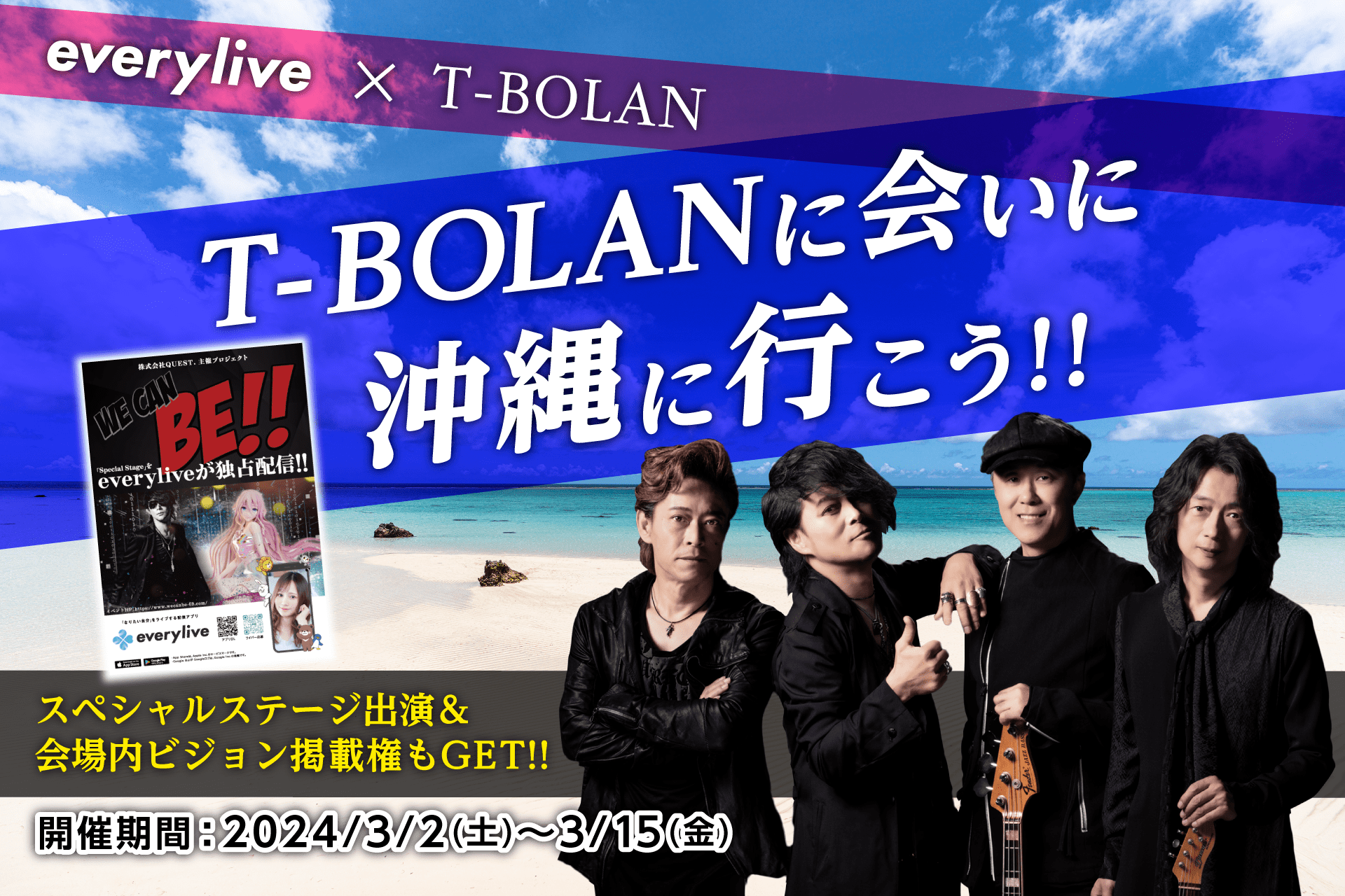 ライブ配信アプリ「エブリライブ」伝説のロックバンド「T-BOLAN」とのタイアップが決定!沖縄で行われるアリーナイベント「WE CAN BE!!」の観覧・出演&ビジョン掲載をかけたイベントを開催!