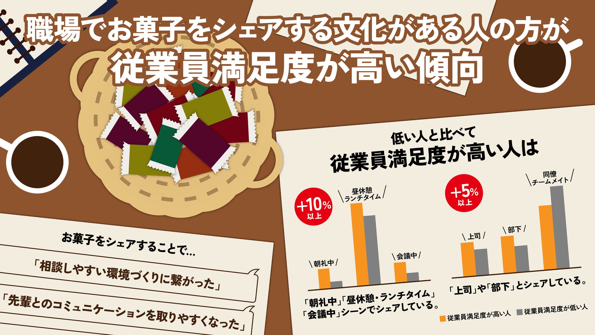 今回の調査で、お菓子をシェアする文化の有無と従業員満足度に相関性があることがわかりました。お菓子をシェアすることが職場での良好な人間関係の構築やコミュニケーションの増加、モチベーションアップなどに寄与し、従業員満足度につながっているのかもしれません。