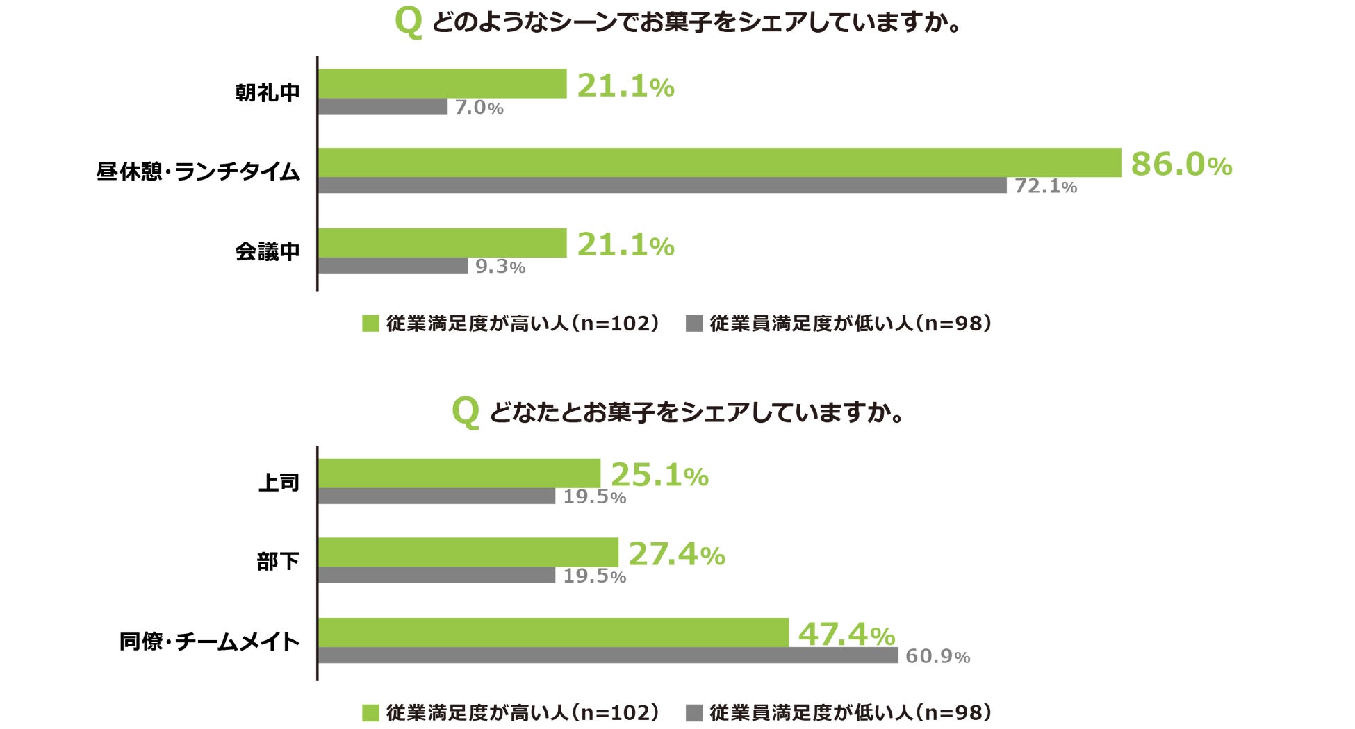職場でお菓子をシェアする文化ある人のうち、従業員満足度が高い人のシェアするシーンやシェアする相手の傾向が明らかに。