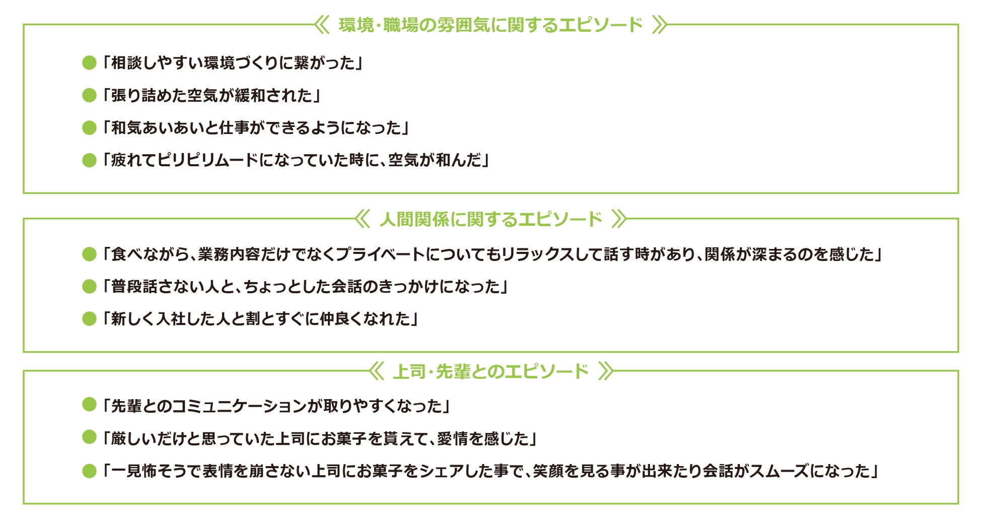 お菓子のシェアで「相談しやすい環境づくりに繋がった」「会話が増えた」といった声も