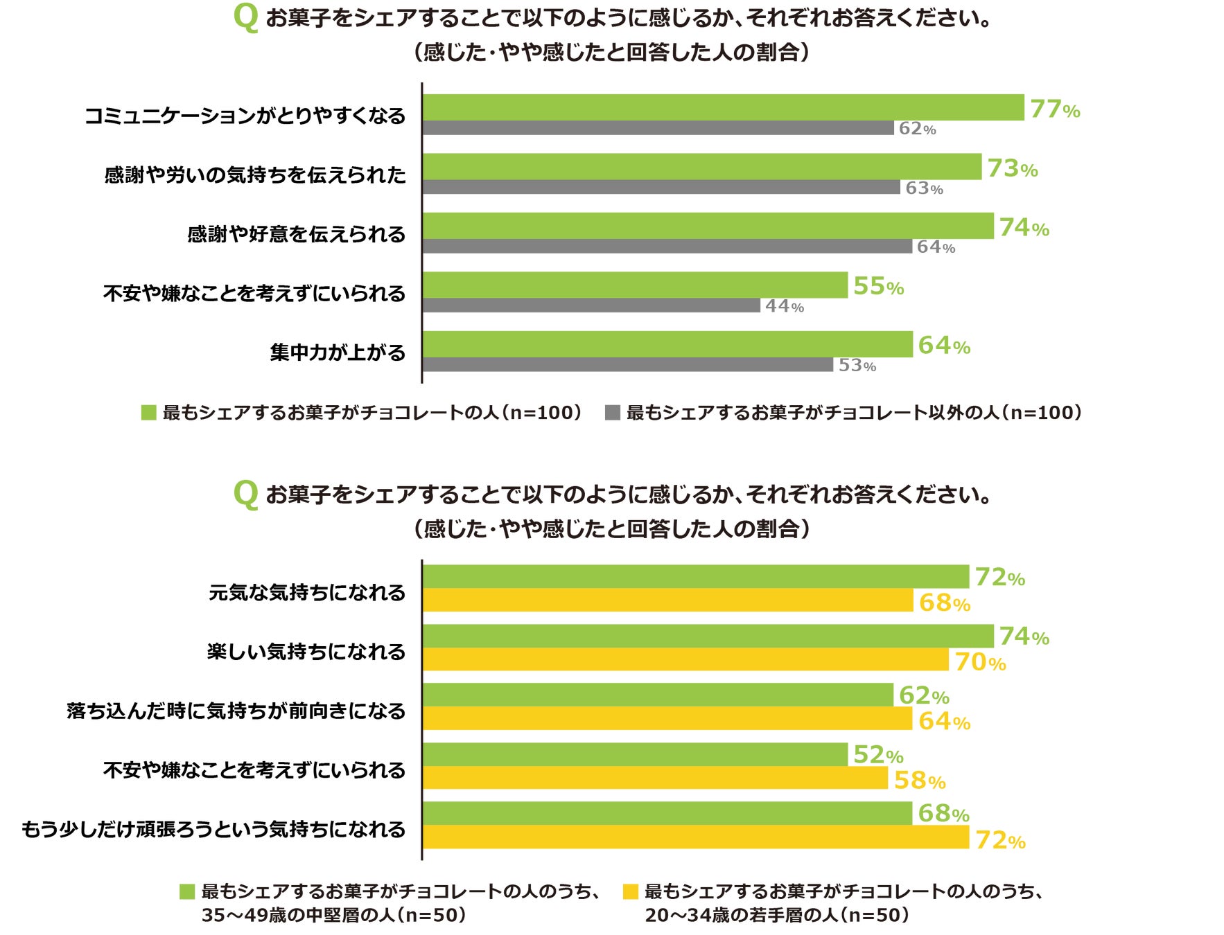 また、最もシェアするお菓子がチョコレートの人のうち、35~49歳の中堅層の人は幸福度向上につながる要素を「感じた」と回答した割合が全体的に高い傾向が見られました。一方で、「落ち込んだ時に気持ちが前向きになる」「不安や嫌なことを考えずにいられる」「もう少しだけ頑張ろうという気持ちになれる」といったネガティブな感情の緩和に関する項目では、20~34歳の若手層の「感じた」と回答した人の割合が、中堅層の割合を上回る結果となりました。