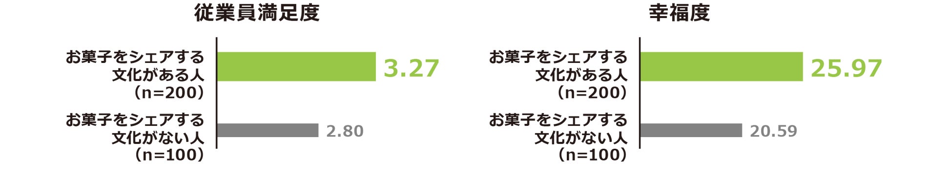 お菓子をシェアする文化がある人の従業員満足度の平均が3.27、お菓子をシェアする文化がない人の平均が2.80という結果に。また、お菓子をシェアする文化がある人の方が幸福度も高い傾向があること