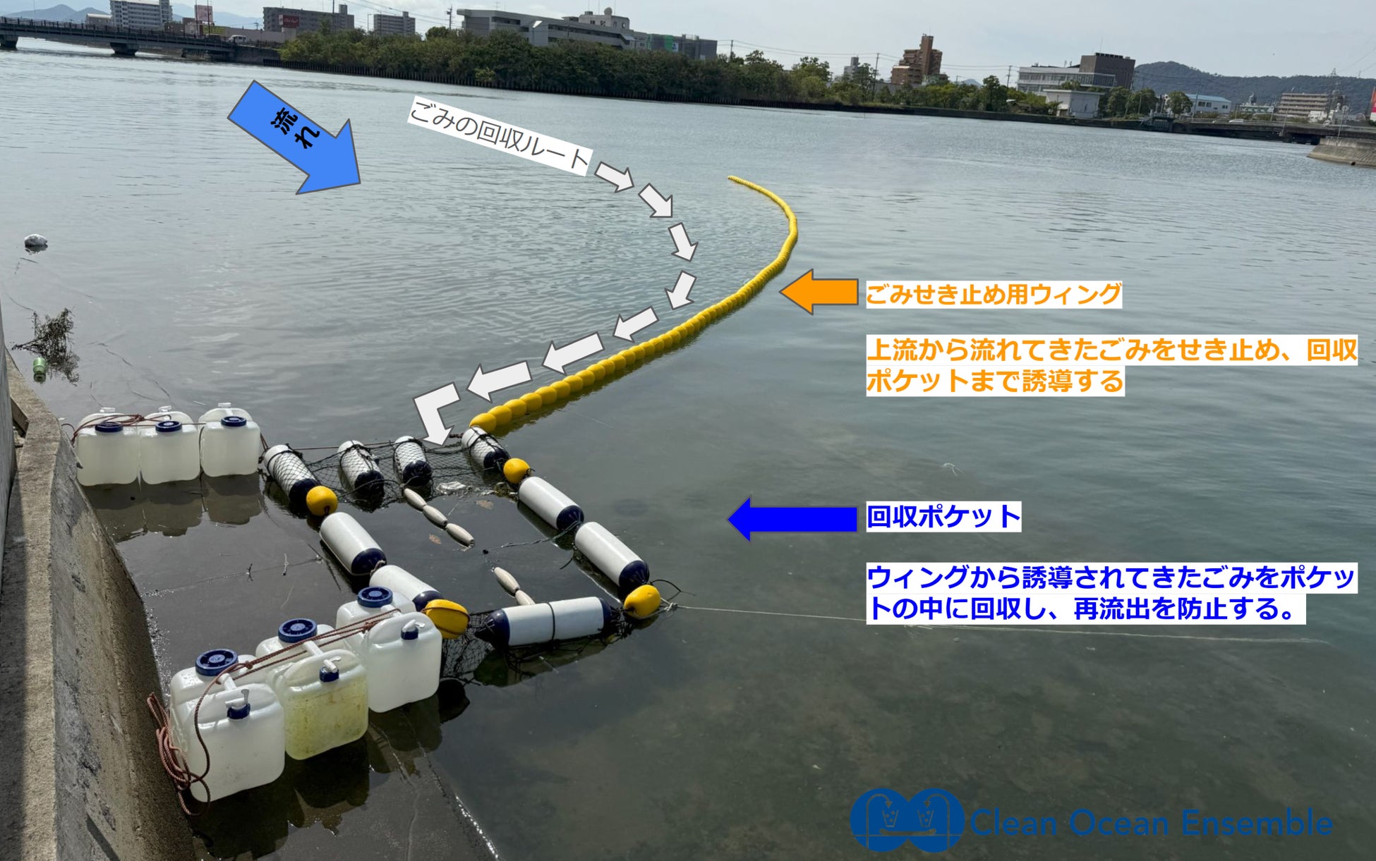 この装置は、フロート・フェンダー・ネット(網)を使用して作られており、川の流れを利用して上流から流れてくるごみをせき止めポケットへ回収します。