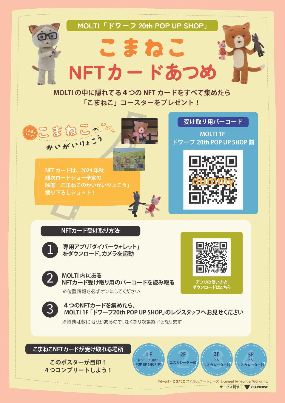 株式会社ゼクサバース(本社:東京都千代田区、代表取締役:上瀧 良平、以下「ゼクサバース」)は、MOLTI(所在地︓ 福島県郡山市)で開催する「ドワーフ20th POP UP SHOP」にて、こまねこNFTあつめを開催します。またデジタル展示物として、こまねこメタバースをスマホで体験することができます。