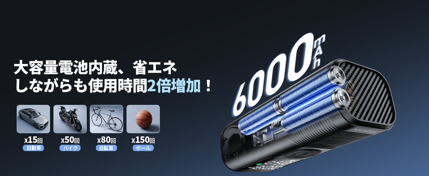 VP-18は、IEC62133認証を取得した6000mAhの大容量バッテリーを内蔵しており、車で約15回、バイクで約50回、自転車で約80回、ボールで約150回の連続充填が可能です。