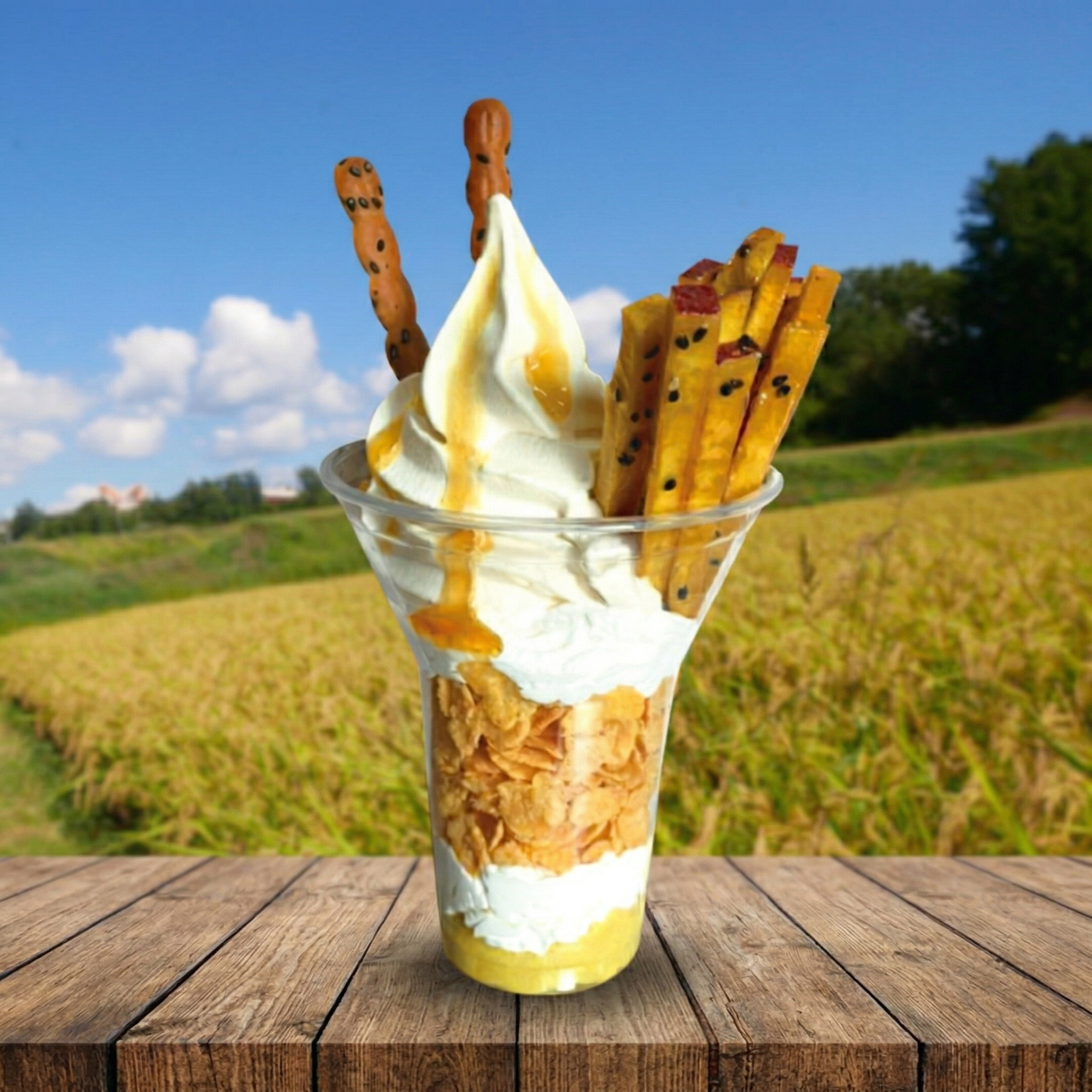 自家製米麹甘酒でつくるライスミルクソフトと農場で栽培した「さつまいも」を使用したオリジナルパフェ。