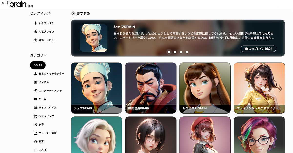 「エージェント」とは、人間の代行として処理を実行するソフトウェアの通称です。「altBRAIN」は、織田信長や著名人のキャラクター生成をはじめ、ゲーム攻略エージェントや内科・小児科などの問診で使用可能な問診エージェントなど、多岐にわたるエージェントの作成をノーコードで容易に行うことができるプラットフォームです。現在のα版では約20種類のエージェントを用意し、そのすべてを無料で利用できます。なお、本サービスの正式ローンチは2023年7月を予定しており、その時点では100体以上のエージェントの提供を目指しております。