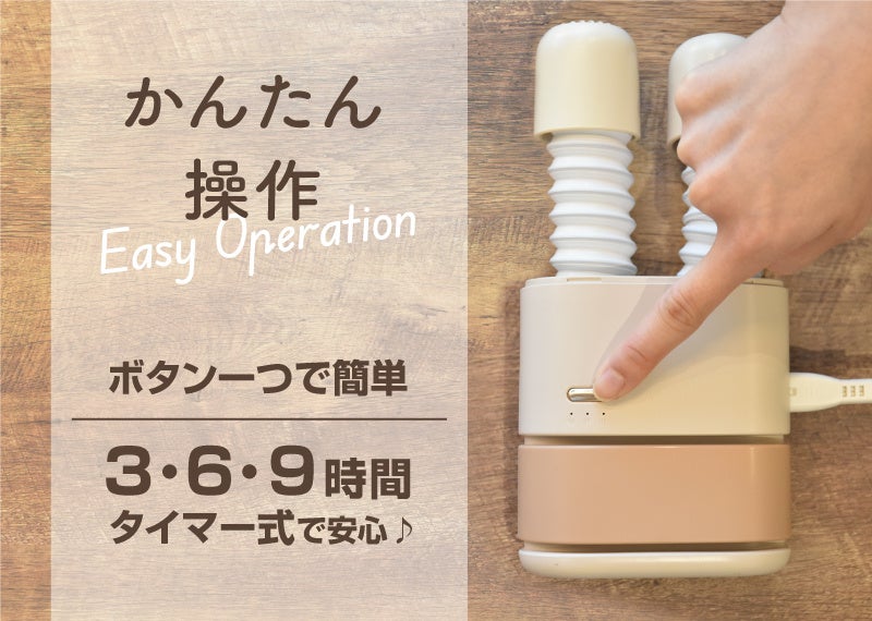 サイズは高さ160mm幅107mm奥行58mm。重さ300g。靴箱に入れて収納できるサイズです。本体内に収納されている2本の蛇腹を引き出し、靴にセット電源を入れると約70度の温風が噴き出し、靴を乾かします。3,6,9時間の3段階のタイマー設定が可能。