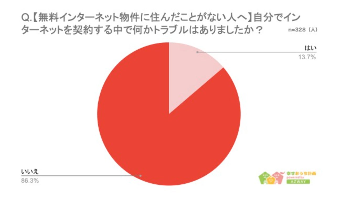 最後に、「自分でインターネット契約をした際、トラブルにあったことがあるか」について聞いたところ、「はい」と答えた人が45人(13.7%)、「いいえ」が283人(86.3%)という結果になりました。自分で契約した人の方がインターネット無料物件の人と比べてトラブルの割合が少ないという結果になっており、インターネット業者の選定が重要であることがわかります。