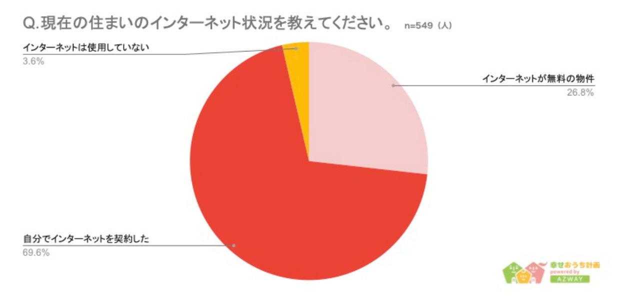 10代から60代以上までの回答者549人に「現在の住まいのインターネット状況」について聞いたところ、「インターネットが無料の物件に住んでいる」と答えた人は147人(26.8%)、「自分でインターネットを契約した」が382人(69.6%)、「インターネットは使用していない」が20人(3.6%)という結果になりました。