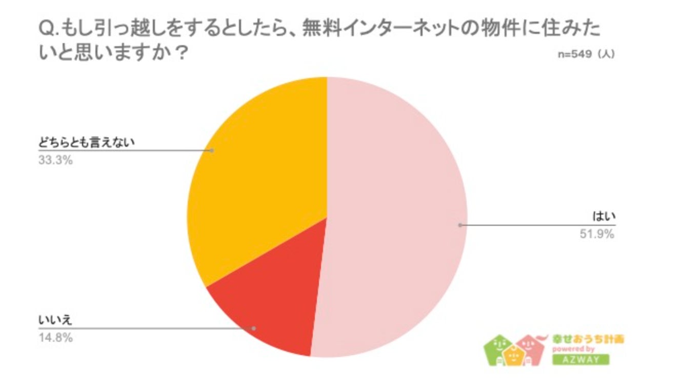 今回不動産メディア「幸せおうち計画」を運営する、株式会社AZWAY(本社:東京都豊島区、代表取締役:井口梓美)は、10代から60代以上までの549人を対象に「インターネット無料は賃貸物件選びにどのくらい影響するか」についてアンケートを実施しました。